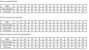 Pour le tissu principal : du lycra ou du jersey avec un pourcentage d’élasticité supérieur à 10%.