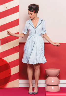Voici Adèle, la robe confortable, élégante et pratique. Sa taille ajustée marque une poitrine haute et allongera vos jambes! Son col tailleur et sa finition passepoilée rappellent les uniformes de diner américain des années 50, pour une allure ultra féminine. Les différents panneaux de la jupe lui donnent beaucoup d’ampleur au niveau des jambes !