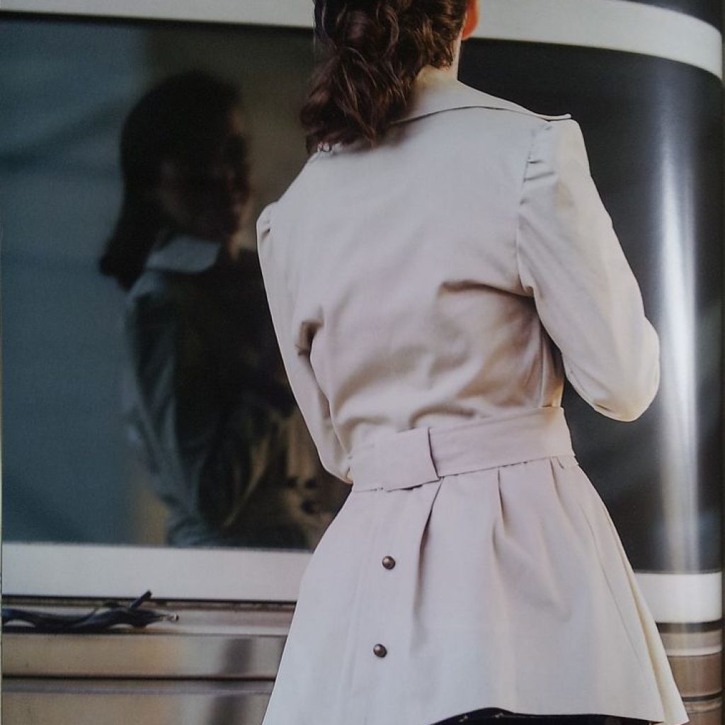Trench/Redingote très chic, ceinturé (ou non). Le versant « trench » est obtenu par un double boutonnage croisé devant, un bavolet allongé et unilatéral, et un large col rabattu monté sur pied de col. Le versant « redingote » est quant à lui obtenu par une taille resserrée et une « jupe » évasée structurée par des petits plis. Cette dernière est fendue et boutonnée au dos pour plus d’originalité. Les manches longues sans découpe sont froncées aux épaules pour un rendu très féminin
