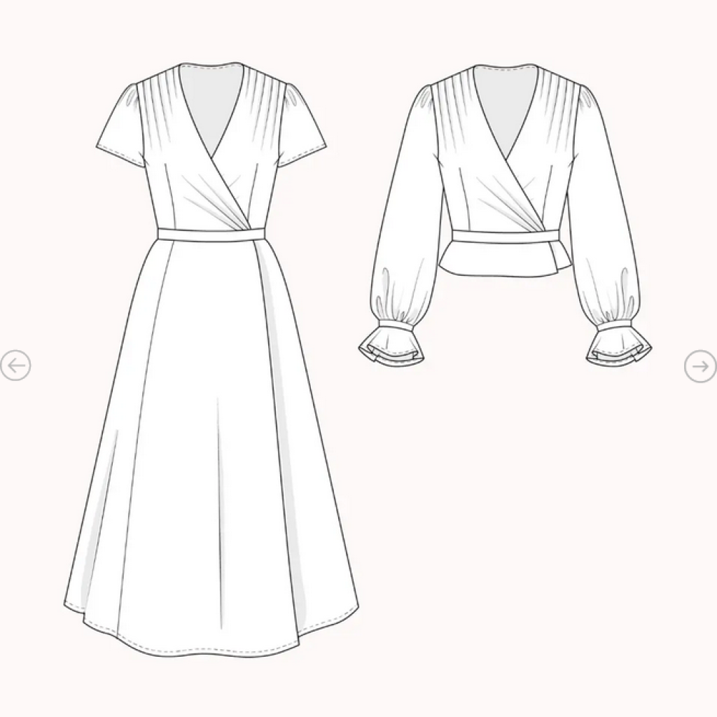 robe/blouse portefeuille, col V, ajustée à la taille, entièrement doublée au niveau du corps (compatible avec un tissu transparent)