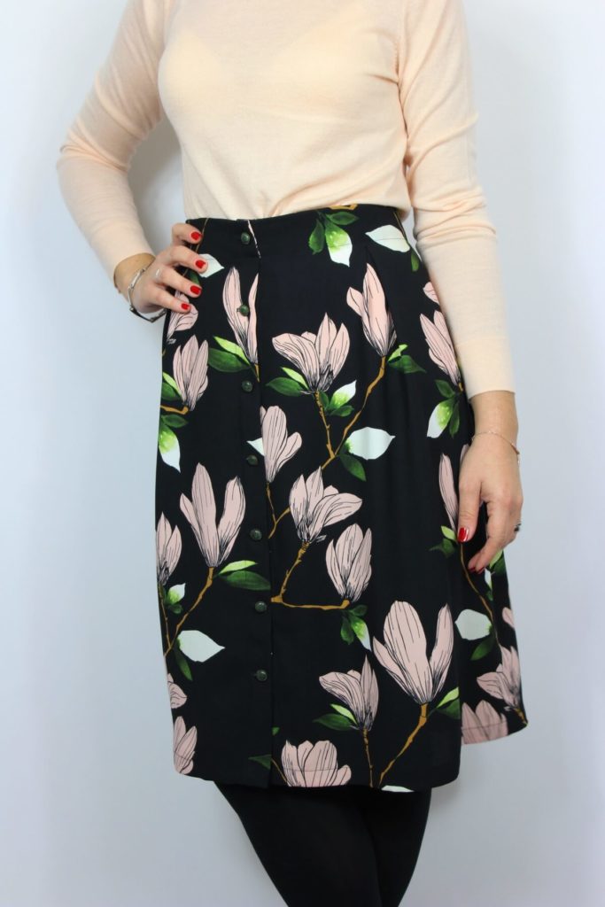 Berta est une jupe à plis creux avec boutonnage frontal. Une parementure permet de bien finir et rendre plus solide la jupe à la taille. Un projet simple et rapide à coudre, idéal pour les débutants qui veulent apprendre la couture et utiliser des patrons indépendant ainsi que pour les plus expérimentés qui veulent réaliser un projet rapide avec un joli résultat.