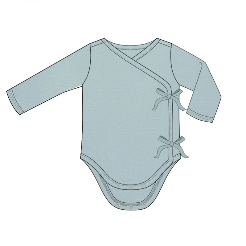 Ajoutez une bordure à ce body de type kimono (ou portefeuille) pour une version moderne et gaie. Ce body est pratique pour changer les couches facilement. On peut le fermer avec des petits liens en ruban ou alors avec des pressions au choix.