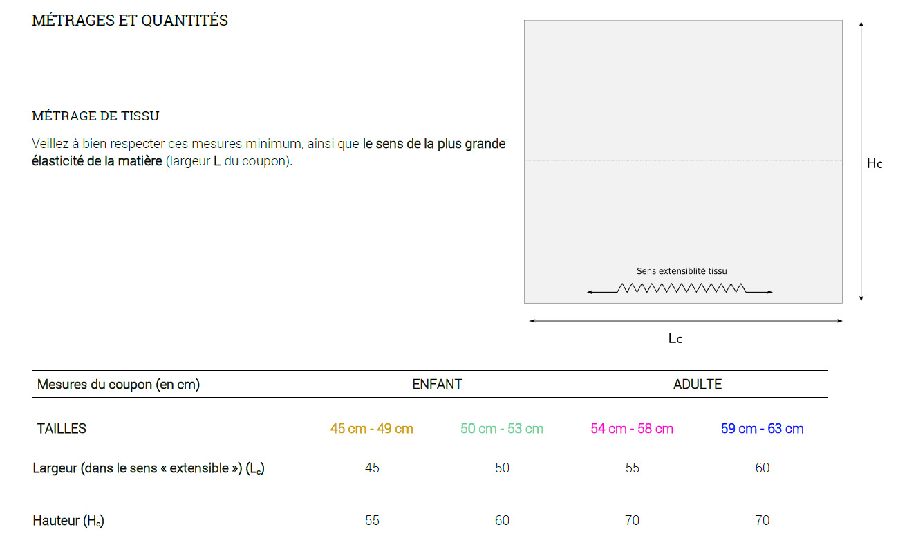 4 tailles : 2 tailles enfants, 2 tailles adultes (de 45 cm à 63 cm de tour de tête)