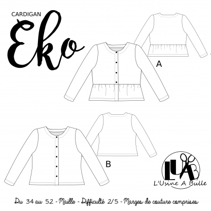 Le Cardigan Eko se compose de 2 versions à coudre dans une maille type sweat. C’est un gilet court à la coupe droite bien que très légèrement cintré sur les côtés, à la taille. Son ouverture est centrale et son encolure est arrondie. Toutes les versions ont des parementures pour assurer de jolies finitions et les ourlets peuvent être réalisés à l’aiguille double pour un résultat très pro. La version A est découpée à la taille avec des basques froncées. La fermeture se fait grâce à des pressions en plastique. La version B est la plus basique. La fermeture se fait également grâce à des pressions plastiques. Et le bas du gilet forme une légère pointe sur les côtés.