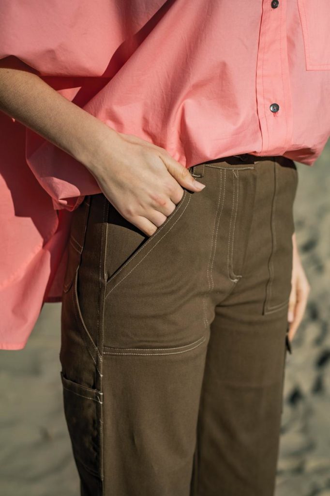 Vêtements de travail faits main. Ce pantalon cargo à taille haute avec une fermeture éclair est un petit défi, mais vous serez très satisfait(e) du résultat. Nous commençons par la partie la plus simple : les jambes droites. Vous appliquez trois poches en biais sans rabat. Une poche avec rabat avec un pli sur le côté. Et au dos, de belles poches arrondies. Les doubles piqûres décoratives et la ganse sur la poche arrière complètent ce patron cool. Go for it !