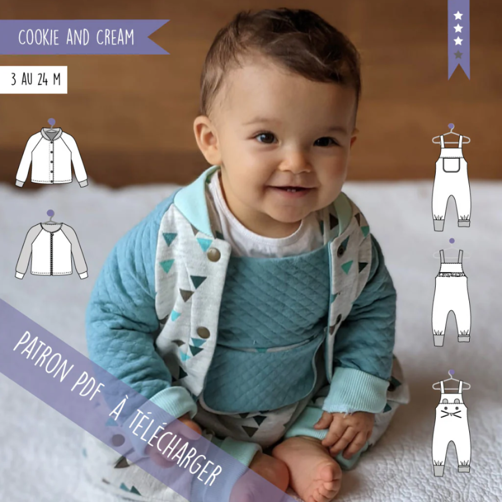 Cookie & Cream est un ensemble adorable et confortable pour les bébés, composé du gilet Cookie : avec ses manches raglans il est facile à monter et se décline avec ou sans col, avec une patte de boutonnage ou un zip.