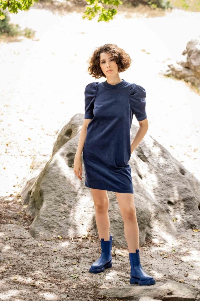 Dina, c’est la simplicité avec une attention particulière pour les manches. La pince garantit une coupe parfaite. Les manches sont montées froncées et le pli supplémentaire crée un beau volume. Le tout a encore plus de style grâce au petit col montant avec bouton-pression et la fermeture éclair invisible au dos. Un ensemble parfait avec la robe Iris pour votre fille. Pour la version robe, nous avons opté pour une longueur juste au-dessus du genou, mais c’est vous qui voyez.
