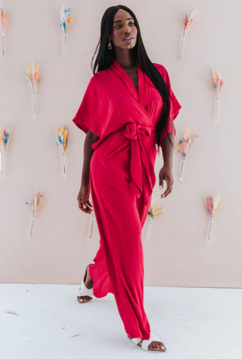Voici Drew, l’élégance incarnée. On y retrouve le décolleté, les manches larges inspirées des kimonos, et la ceinture nouée de Bella, mélangés avec un pantalon ample, qui allonge les jambes.