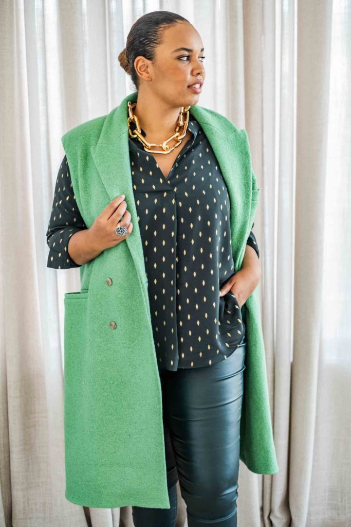 Vous souvenez-vous de Hunter ? Il nous a inspiré ce gilet quatre saisons. Et parce qu’on a envie d’en faire juste un petit peu plus de temps en temps, nous avons cinq beaux détails sur le devant : un col élégant avec un revers, un double boutonnage, des épaulettes, une poche poitrine avec liseré et des poches sans rabats. La doublure complète lui donne un effet encore plus chic. La fente manteau vous assure suffisamment de liberté de mouvement. Vous attirerez tous les regards si vous portez Elba avec le pantalon Freja ou Peaches dans le même tissu. On en est sûr : ce modèle deviendra un classique pour chaque saison. Intemporel et légèrement androgyne.