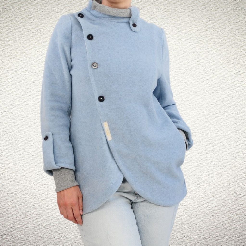 Le patron Eliane te permet de confectionner une veste de transition extravagante avec un col montant et des fausses fermetures au col et aux manches.