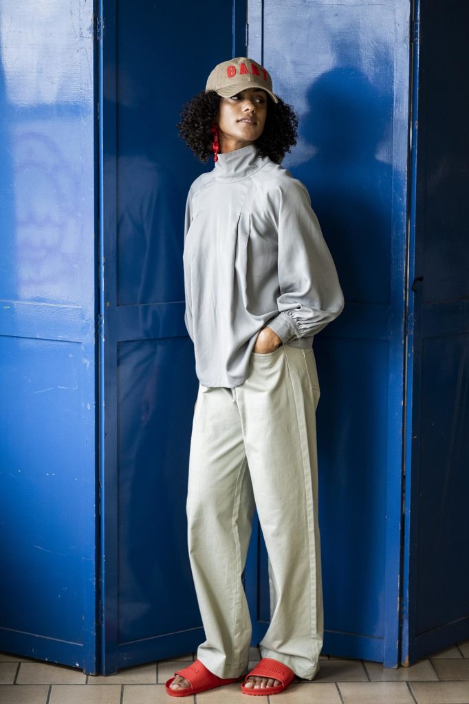 Vous cherchez une pièce forte pour votre look ? Voici Grace, un chemisier avec une belle coupe, un col relevé avec des rubans à nouer et des manches raglan avec des poignets de manche fins. Le devant a des plis souples.