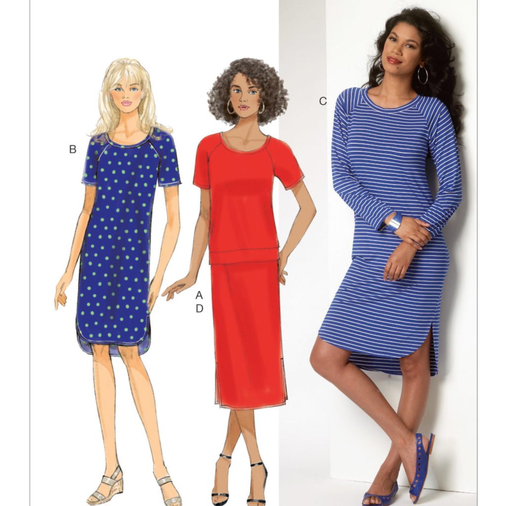 Le haut pull et la robe ont des manches raglan, une encolure dégagée, une bande de propreté et un ourlet façonné, sur l’envers. R : Bande inférieure. A, B : Manches courtes. C : Manches longues en deux pièces. La jupe a une taille élastique et des fentes latérales. Tous sont ajustés et ourlet étroit.