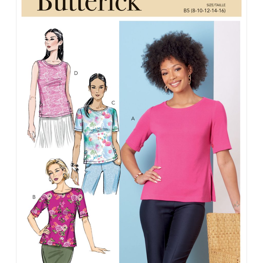 Le t-shirt mis à jour, dimensionné pour les tricots extensibles, a des manches jusqu’aux coudes avec ou sans fermetures à boutons et des ouvertures de couture latérales. Le haut à manches courtes ou sans manches a une fermeture boutonnée sur la couture latérale. Les vues arrière ont une option pour une ouverture coucou.