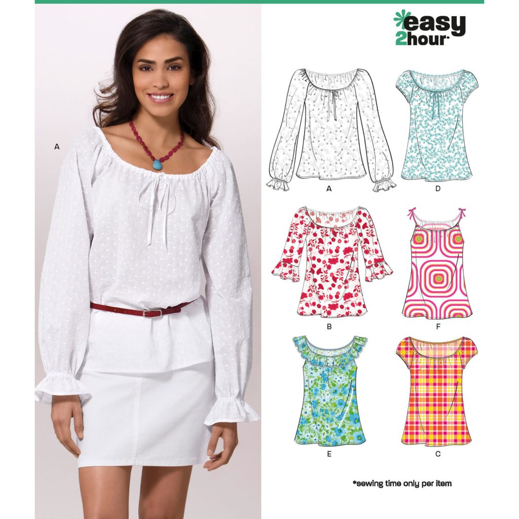 Hauts faciles pour Miss avec variations d’encolure et de manches. Temps de couture de 2 heures.