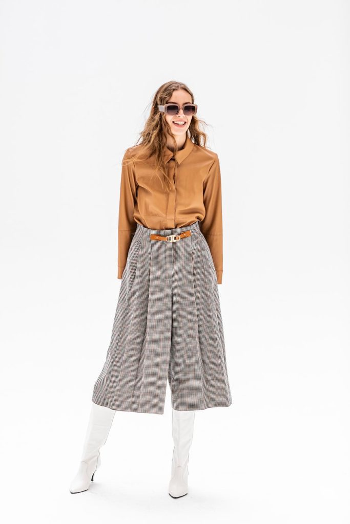 Cette chemise en cuir associe sexy et cool. Mais aussi style, car Isra a une coupe minimaliste avec une fermeture à boutons invisibles. Cool à porter ouverte, mais également glissée dans un pantalon ou une jupe ou bien nouée en bas, c’est top. L’ourlet a une finition avec un ruban en biais. Les manches montées sont droites et ont de simples poignets sans fente. Les coutures sous le buste et au milieu des manches sont typiques pour les vêtements en cuir. Vous n’êtes pas fan de ces coutures ou vous voulez réaliser cette chemise dans un autre tissu ? Assemblez tout simplement les pièces du patron. Parfait.
