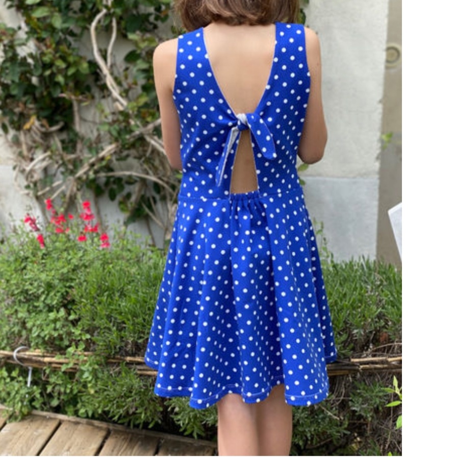 Robe avec encolure dos nue noué à réaliser en jersey pour l'été de nos filles Robe avec découpe à la taille élastiquée sur une partie du dos Matières préconisées: jersey ou maille souple