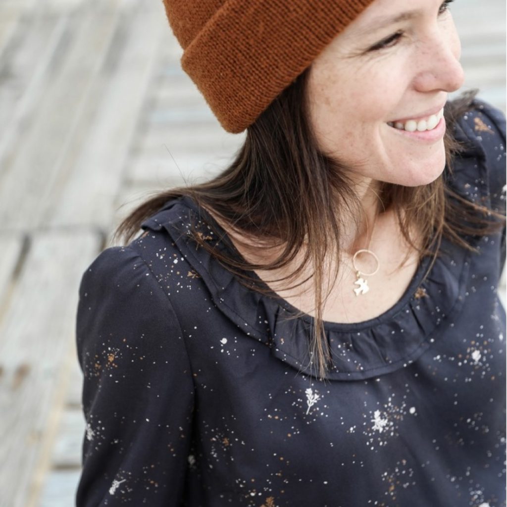 Soulignée par un froufrou, la large encolure ronde de cette blouse fait tout son charme. Manche droite, légèrement froncée à l’épaule. Peut également se décliner en robe avec l’ajout d’une basque froncée, élastiquée à la taille ou non. A réaliser avec ou sans manches.