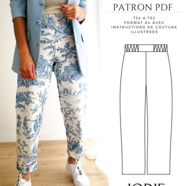 Jodie est un pantalon taille haute, la ceinture comporte un élastique mais elle est plate devant grâce à une technique expliqué dans le tuto. Il a un très joli tombé et une coupe près du corps sans mouler. Sa particularité réside dans sa conception: contrairement aux pantalons classiques, il n’est composé que de 2 pièces de tissu, il est donc très rapide et simple à coudre. Une facilité déconcertante pour la réalisation de ce pantalon !