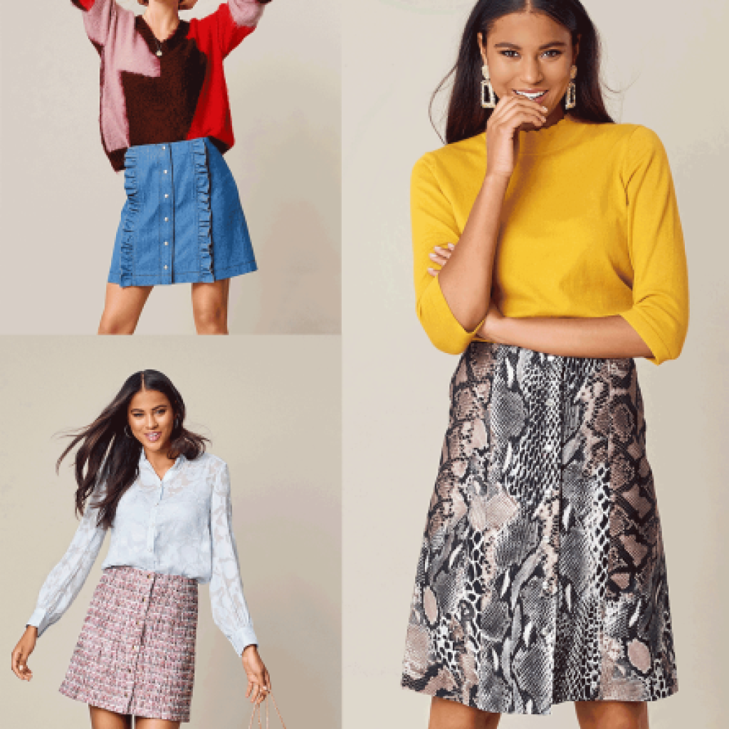A : Coco Chanel se rappelle à nous ! Sa mini trapèze en tweed bouclette est un classique qui vous accompagne avec classe en tout lieu ! Que ce soit à la mairie, une gardenparty, ou encore au bureau ! Montée sans ceinture, elle se ferme sur l’avant par une patte à pressions. Elle peut aussi se porter décontractée avec des baskets ! B : Fashion toute ! L’impression python est une des tendances phare de la saison automnehiver ! Sa longueur juste au-dessus du genou en fait un modèle portable en toute circonstance. On peut aussi la préférer dans une étoffe plus discrète, avec sa patte de pressions, elle est de plus facile à réaliser. C : Elle revient en force, la mini trapèze en denim ! On l’a vue sur tous les défilés et en masse sur Instagram. La nôtre est classique avec une patte de pressions et des surpiqûres, mais se distingue par deux ruchés latéraux au niveau des découpes. Retrouvez les conseils pour les coutures jean dans nos explications.