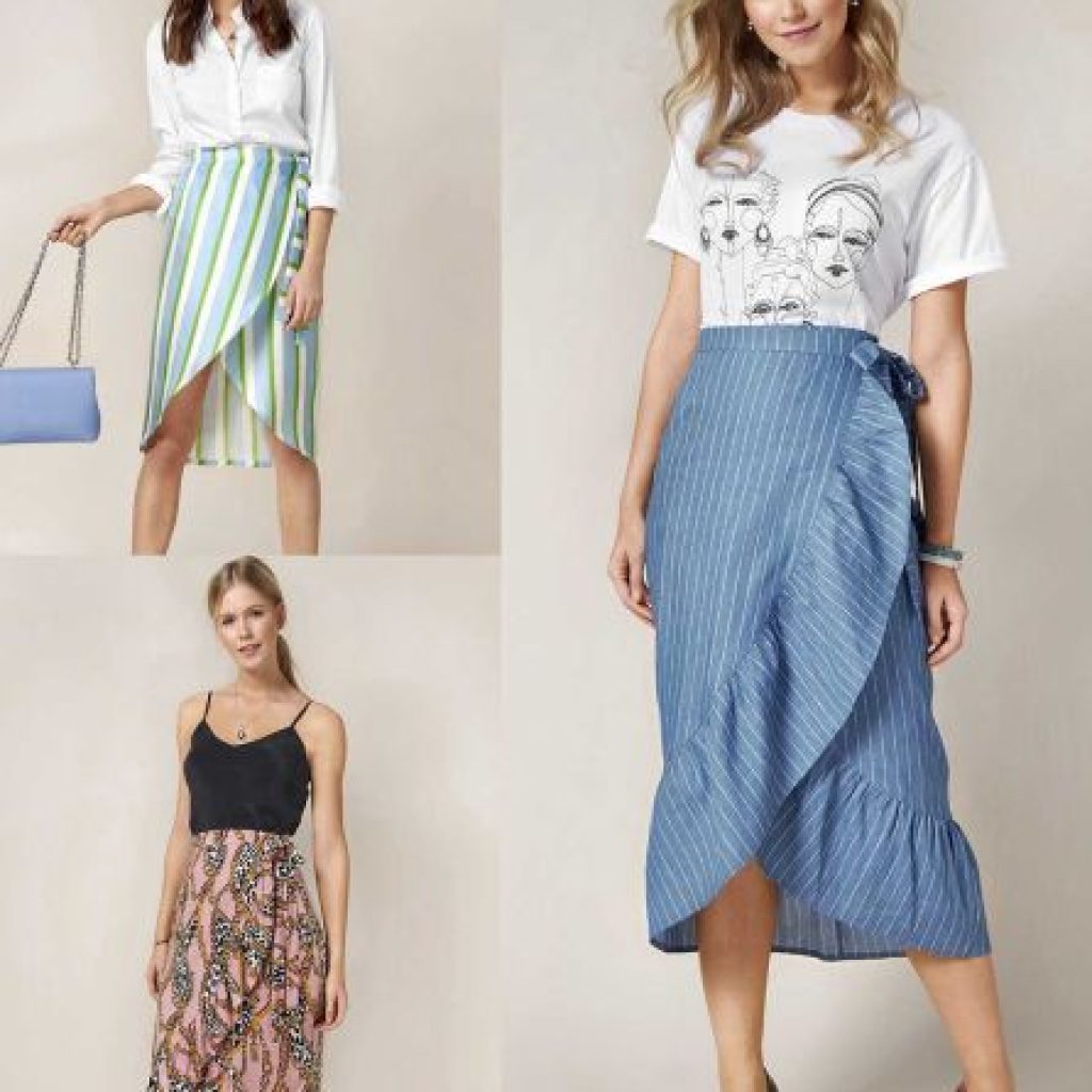 A : Sobre et chic, la jupe portefeuille en soie ne nécessite que de l’étoffe et une pression. Elle se noue à la taille au-dessus de la pression. Elle sera parfaite au bureau avec un chemisier léger, et plus décontractée avec un t-shirt et des baskets. Et le soir, elle sera super avec un top à fines bretelles et de belles sandales à talon. B : Envie d’un peu de fantaisie et de couture avec quelques défis ? La jupe arbore une ruche qui longe l’ourlet et remonte jusqu’à la taille. Le motif ? Une impression baroque mixant le léopard, les chaînes et les pampilles dorées sur un fond rose. Un motif de foulard et vrai must cet été. Mais elle sera belle aussi en teinte unie. C : En quête d’un modèle ultrafashion ? Alors vous l’avez trouvé ! La fine rayure chemise d’inspiration masculine joue le contraste avec les larges ruches qui bordent les ourlets et font danser le modèle de façon très féminine. Le sens des rayures souligne la coupe de la jupe et la longueur midi est à son tour ultratendance.