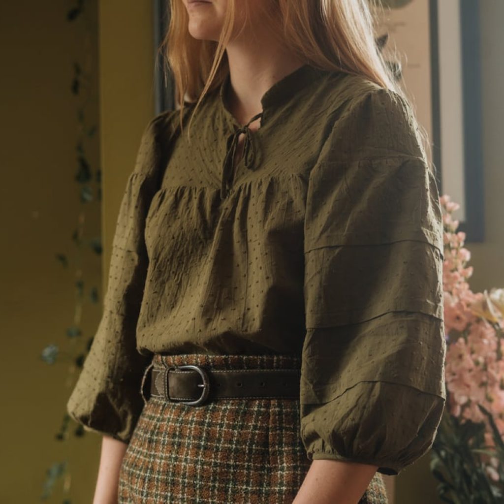 Kaolin est un patron de blouse bohème confortable avec des détails esthétiques tels que des plis religieuse et des fronces