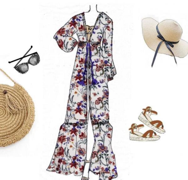 Associez votre robe Kimono à une paire d’espadrilles ou de sandales plates, un chapeau de paille et un panier en osier pour une virée playa. En soirée, troquez vos sandales plates par une paire de compensées et une pochette pour un look d’été frais.