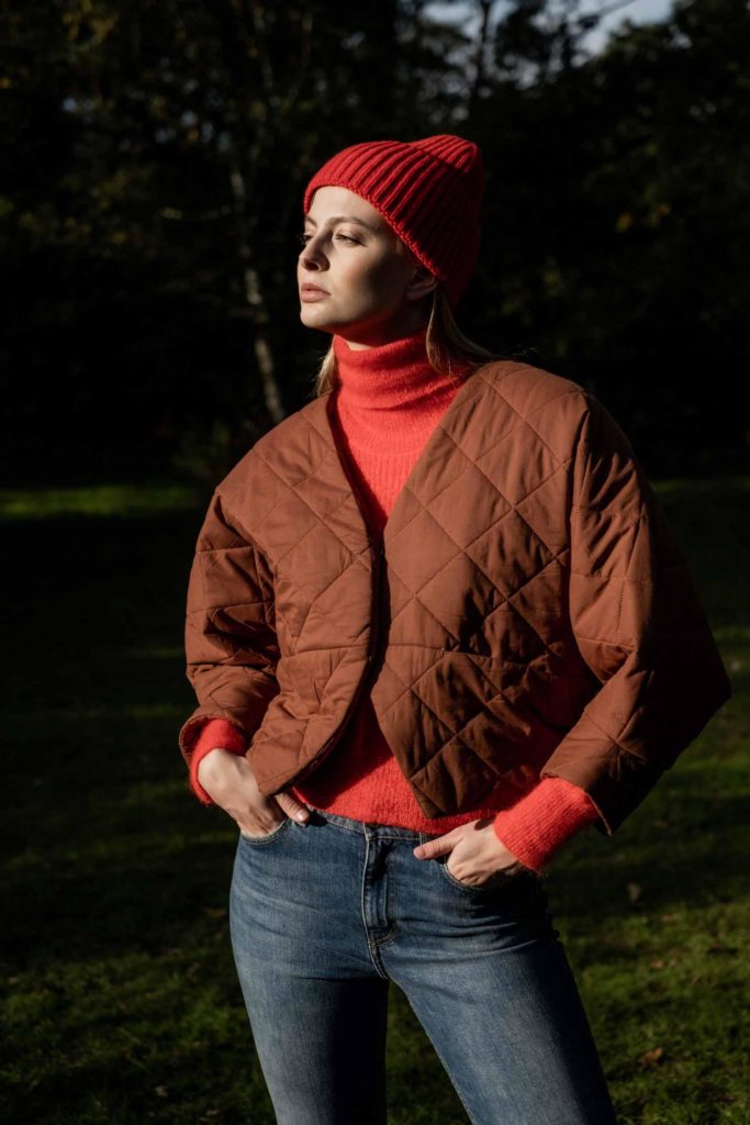 Vous pouvez réaliser la veste Lucy dans de nombreux tissus, selon le look souhaité. Un joli petit anorak ? Réalisez Lucy dans un tissu matelassé ou quilt. Une veste mi-saison confortable ? Utilisez un tissu tricoté, comme un interlock ou un jacquard, par exemple. Une chemisier kimono ? Coupez Lucy dans un tissu tissé, par exemple un crêpe de viscose, un lyocell, un satin de soie ou un jacquard… Un tissu en laine donnera un résultat élégant. Avec du velours côtelé (milleraies), du denim, du suède, du cuir vous obtiendrez un multitude de styles différents.