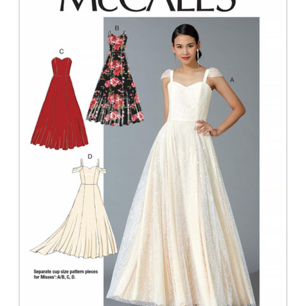 Robes doublées et ajustées avec des coutures princesse et des bretelles assorties. A : Superposition contrastée. C, D : Ourlet irrégulier, l’envers du tissu sera visible. Patron séparé pour les bonnets A/B, C et D inclus.