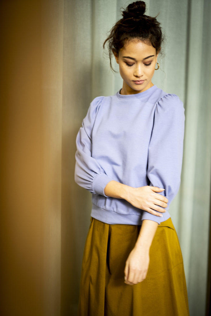 Réalisez Mabel dans un tissu tricoté. Optez pour un tissu à bouclette, un jacquard tricoté, un tissu à sweat-shirt ou un jersey fantaisie.