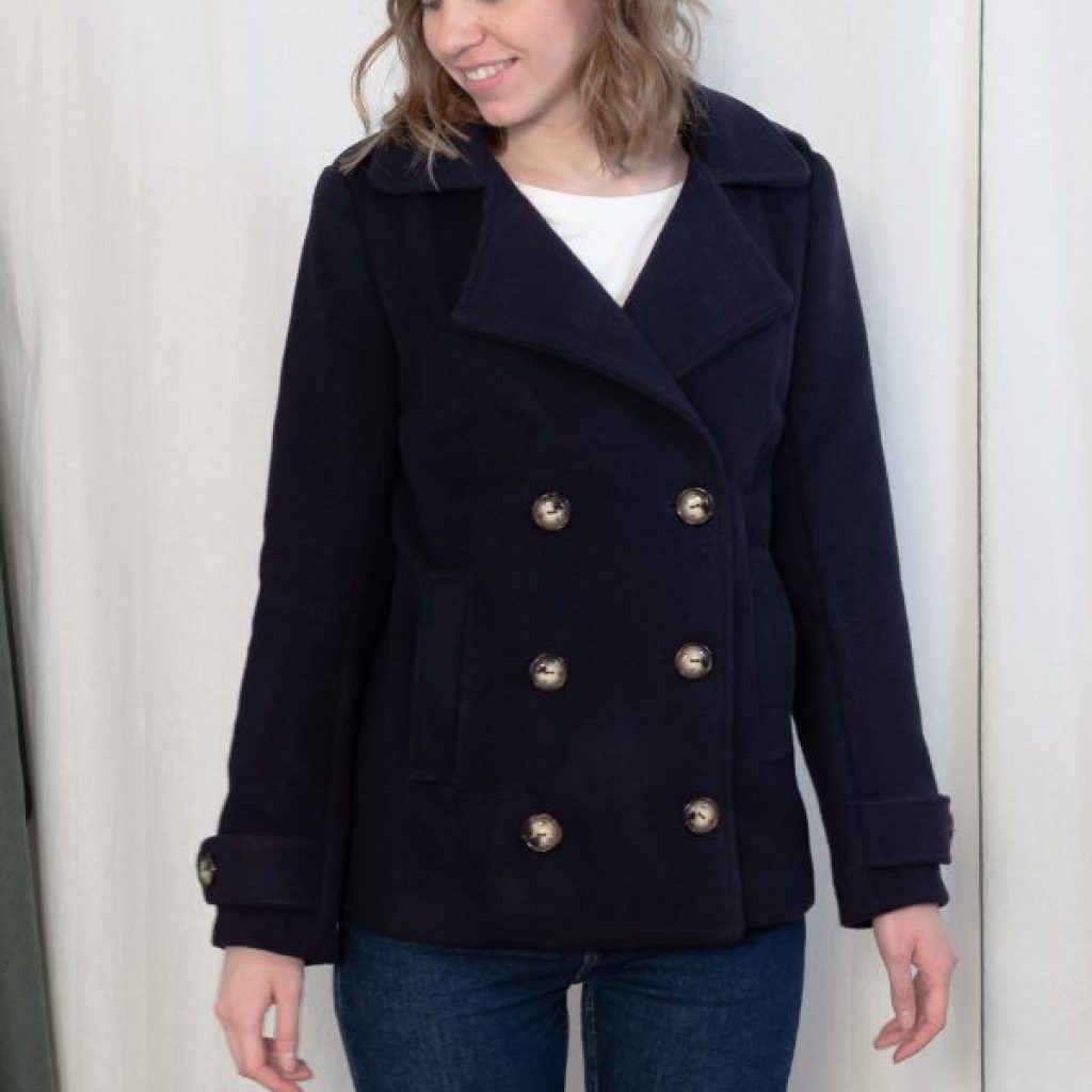 Drap de laine, lainage caban, laine bouillie. Privilégier un tissu qui a de la tenue, éviter les tissus trop “mous”.