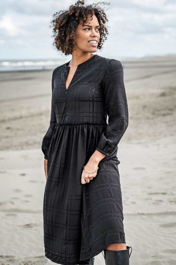 Olive est belle dans toutes les matières : des tissus souples, plus raides ou même plus lourds. Selon l’effet souhaité, vous choisirez donc un tissu souple ou raide. Pour les tissus plus raides, nous pensons popeline, cuir ou chambray. Si vous voulez qu’Olive soit souple, optez pour de la soie (ou du satin de soie), du lyocell, du crêpe, de la double gaze… Les principaux atouts d’Olive s’expriment le mieux dans un tissu uni ou avec un tout petit imprimé, des rayures fines, par exemple.