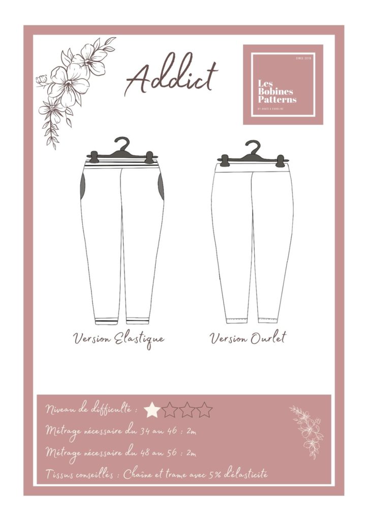 PANTALON ADDICT est un pantalon avec une coupe élastiquée à la taille et aux chevilles, avec si vous le souhaitez des poches du 34 au 56