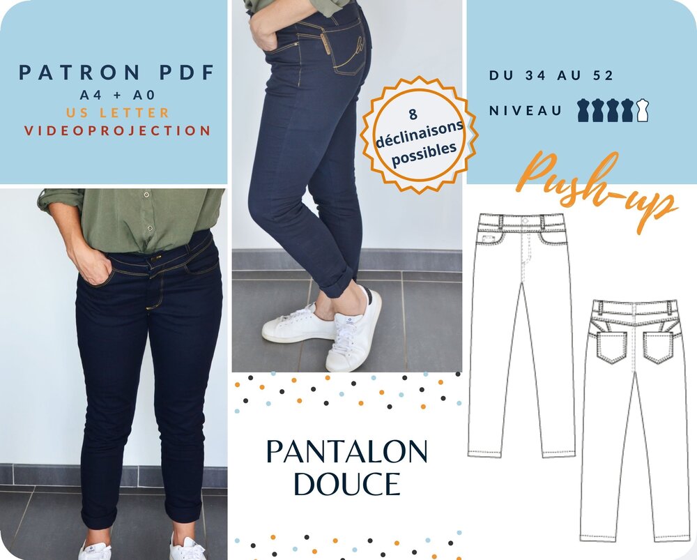 Choisissez votre devant, simple ou avec réhausse, et votre dos, simple ou avec découpe push-up, puis la largeur du pantalon : coupe slim ou droite.