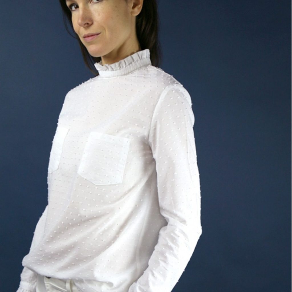 Blouse au col montant style victorien avec deux finitions possibles : soit smockée, soit pied de col avec froufrou. Manches courtes ou longues avec des finitions identiques au col. Blouse légèrement cintrée et absence de pince poitrine pour un style résolument actuel. Les poches plaquées sur la poitrine confèrent un joli contraste à cette blouse plutôt classique.