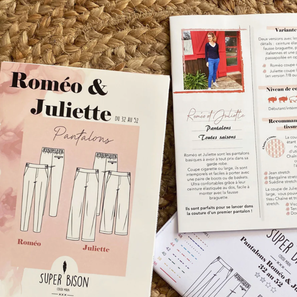 Ce tout nouveau coffret comprenant la planche de patron à taille réelle gradée du 32 au 52 en couleur, le livret explicatif avec le pas à pas illustré en couleur également pour réaliser les 2 modèles : le pantalon Roméo et le pantalon Juliette.