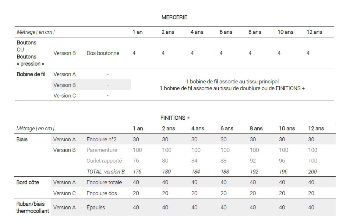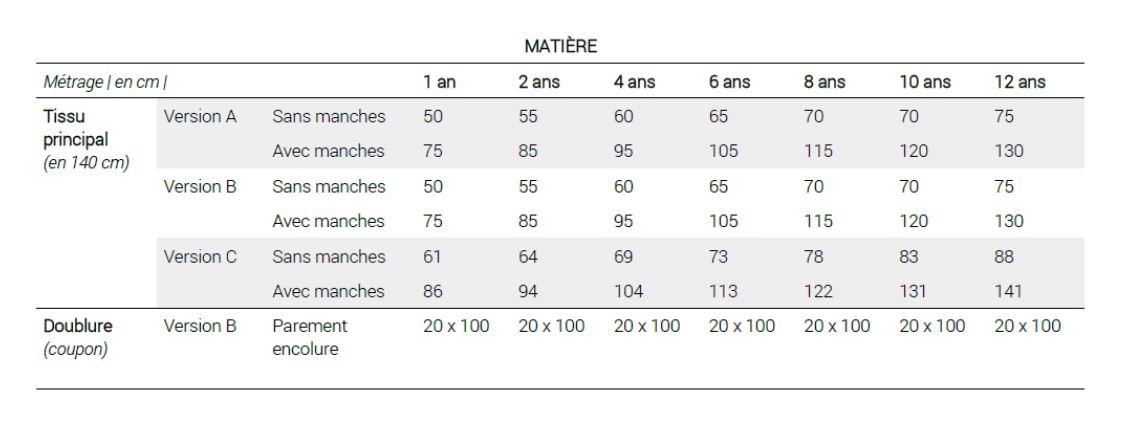 Tailles : 1-2-4-6-8-10 et 12 ans