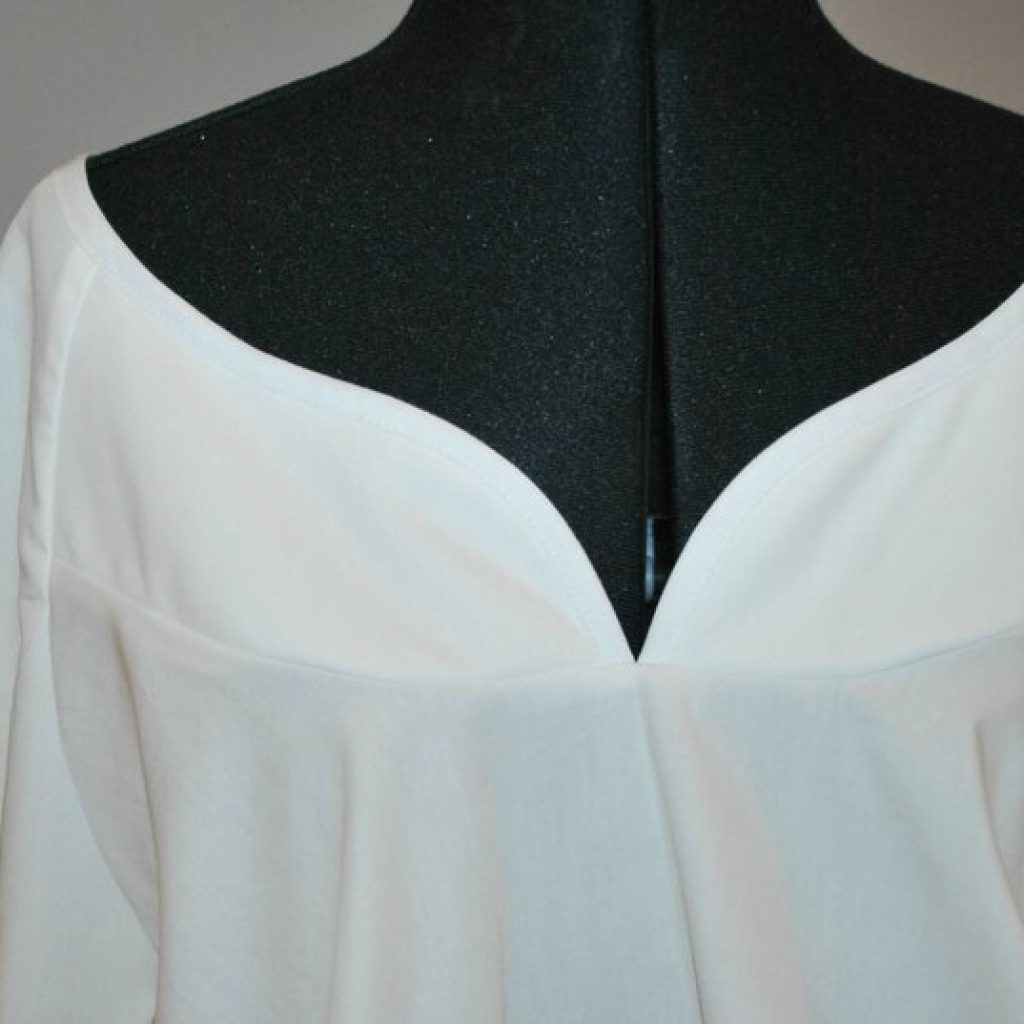 Robe très ample à godets et à manches longues type « raglan ». Sur le devant, une découpe « cœur » confère à l’encolure une forme originale permettant un subtil mélange de féminité et de sagesse. L’encolure est non seulement échancrée sur les épaules mais aussi au dos, dégageant ainsi délicatement la nuque et le cou. Froncées au dessus des poignets, les manches longues d’un seul tenant donnent l’illusion de posséder des bracelets de manche. Le dos de la robe est noué par un ruban monté sur une fente.