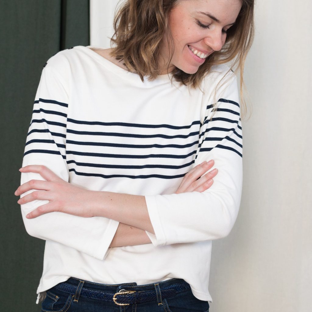 Tout le charme de la Marinière Pont-Neuf se joue sur les épaules : le devant et le dos se rejoignent et sont maintenus par des boutons, le tout joliment fini grâce à une enforme surpiquée.