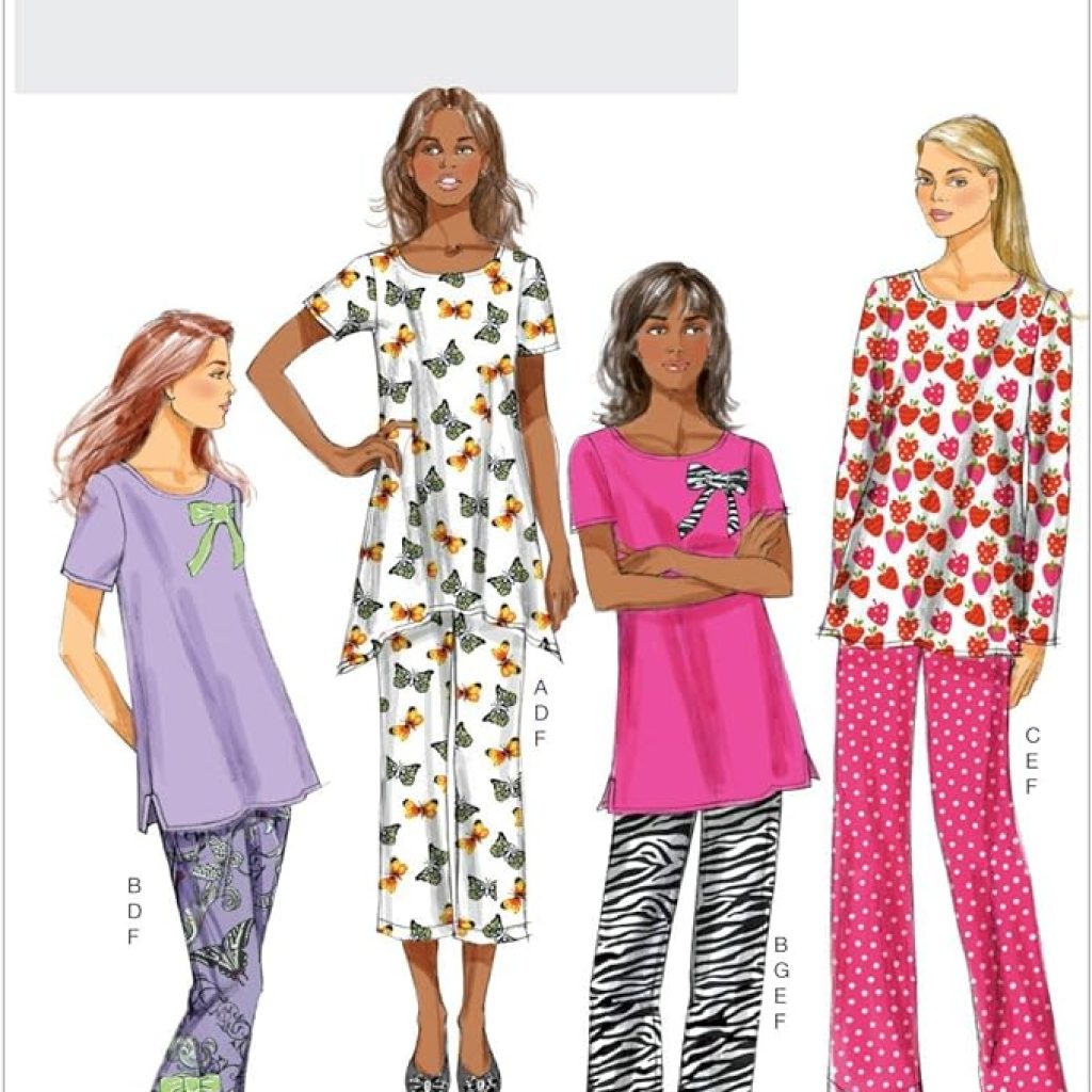 Coupe ample, pull avec variations d’ourlet et ourlet étroit. R : Le mauvais côté du tissu peut apparaître sur l’ourlet. B: Fentes latérales. B, C, D : appliqué acheté. Pantalon semi-ajusté à jambes droites avec taille élastique et ourlets cousus. Nœud en option. Chaussons doublés avec dos élastique et semelle. Acheté de pierres précieuses et de ruban.