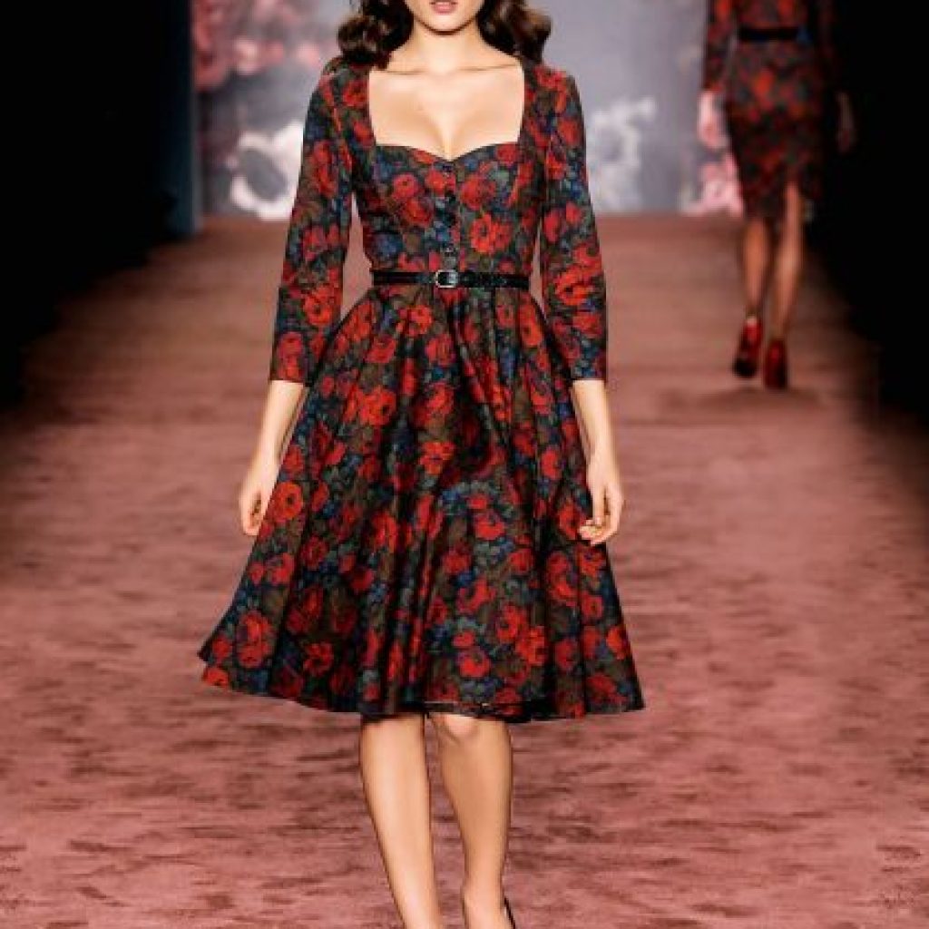 L’Angleterre à la rencontre de l’Autriche: larobe ultraféminine avec son buste boutonné, son décolleté en cœur, sa taille marquée et sa jupe cloche dansante fait une silhouette de rêve. L’étoffe à grandes roses confère au modèle un petit air vintage.