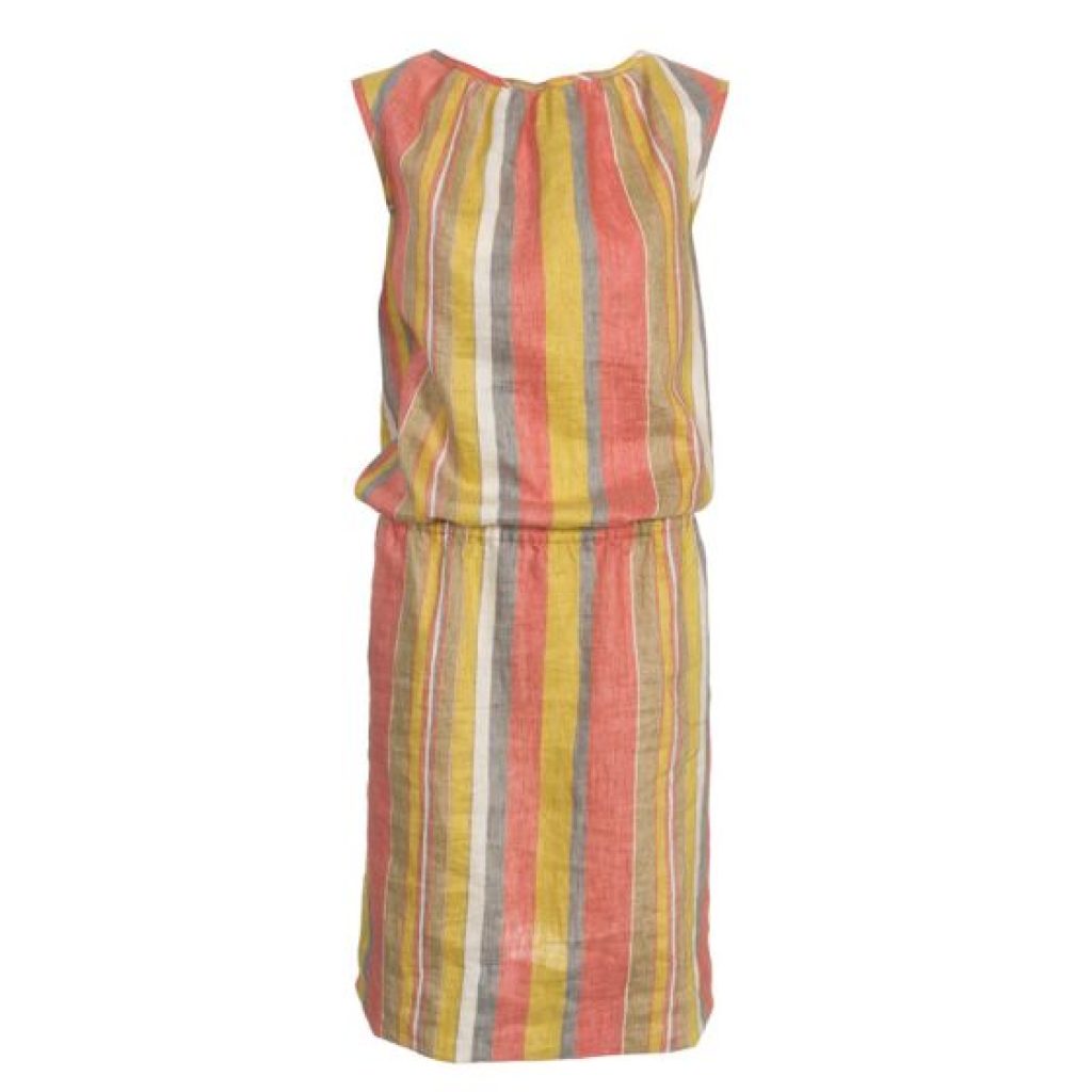 Petite balade à mobylette ? Mais avec joie ! Et avec cette robe, elle sera très agréable. En lin mélangé à rayures bayadères, le modèle est d’une grande simplicité : quelques fronces au cou, des poches, une taille élastiquée et de hautes fentes latérales pour le confort. Une grosse ceinture la finit avec style.