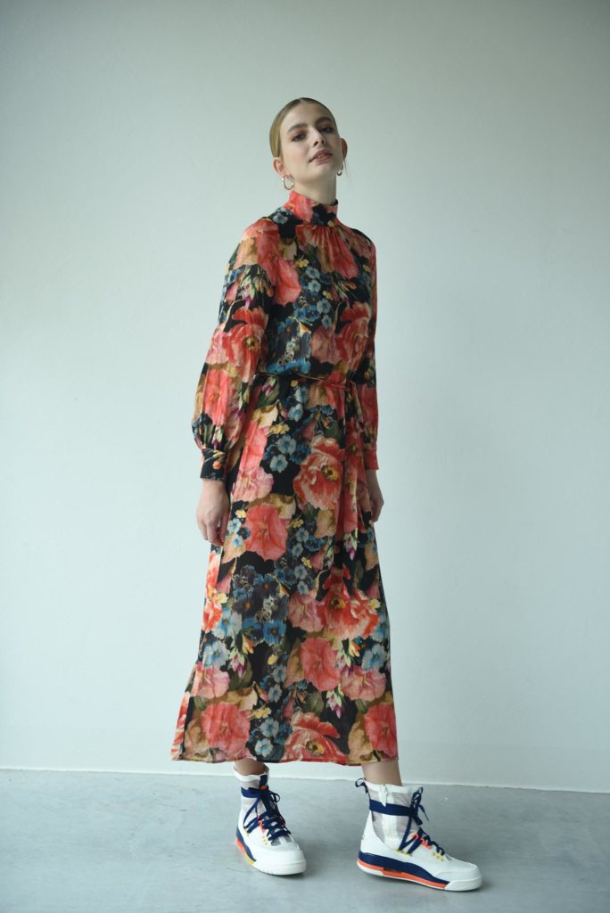 La tendance des robes maxi au niveau des chevilles n’est pas encore essoufflée. La robe Holly rentre parfaitement dans cette tendance. Un petit col montant et des manches bouffantes avec un poignet de manche fin ne pouvaient pas manquer dans ce patron.