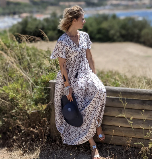 Modèle phare de la collection femme Super Bison, la maxi-dress Idylle a un charme fou avec sa découpe en pointe et ses manches papillons.