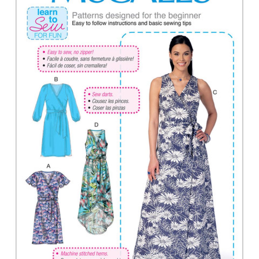 Robe portefeuille ajustée avec ceinture et pinces françaises. A : Manches flottantes. B : Manches Bishop. C, D : Sans manches. D : Ourlet haut-bas (l’envers du tissu sera visible).