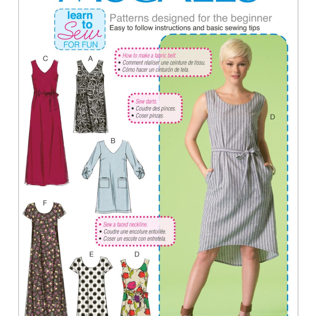 Les robes pull semi-ajustées ont des variations d’encolure et de poches, des pinces françaises et des ourlets cousus. A, B, C : décolleté en V. A, C, D : sans manches. B : Poches plaquées et manches trois-quarts avec bouton et patte. C, D : Auto-ceinture. D, E, F : encolure dégagée, ourlet haut-bas, mauvais côté visible. E, F : Manches courtes. Manches B , ourlet D , fentes latérales C, F : Ourlet étroit.