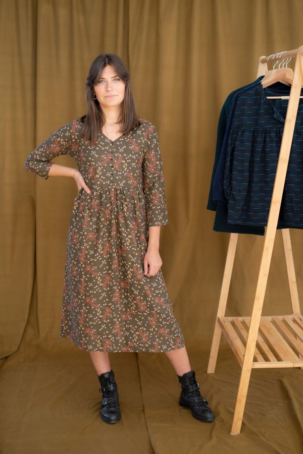 Avec ce kit vous réaliserez Rosie, une jolie robe froncée manches trois-quarts, décolletée en V et boutonnée. La basque est volontairement peu froncée pour éviter tout effet trop volumineux.