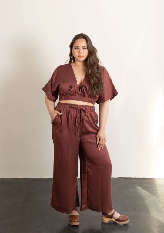 The Saguaro Set is a two piece woven set made up of elastic waistband pants and a pullover top. This is the perfect outfit for road trips through the desert, sunset walks on the beach, or dancing the night away. The pants feature roomy pockets and a waistband with a drawstring. The top has a plunging V neckline that includes an optional tie closure. You can wear the top backwards or forwards. This flowy set is easy to sew and fun to wear with endless options for customization.