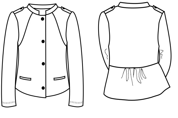 Le patron Sarah est une veste cintrée et féminine avec de fausses poches passepoilées optionnelles, des pattes aux épaules, des fronces dans le dos ainsi qu’aux têtes de manche. Cette veste moderne se marie parfaitement à une jupe ou un pantalon et sera une pièce phare du dressing des jeunes filles.