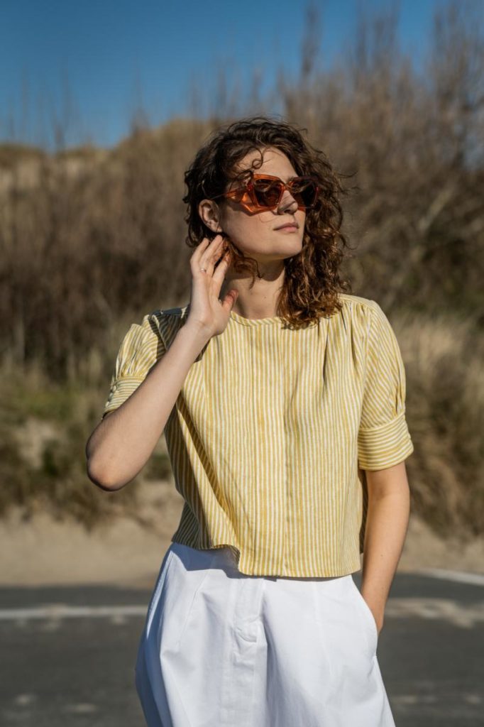 Trop mignon ! Ce haut court a tout ce qu’il faut. Grâce a sa coupe ample, mais élégante avec un grand pli et un effet froncé. Encolure doucement arrondie, patte de boutonnage cachée, manches courtes avec de jolis poignets de manche. Sienna est là pour être vu, porté sur un jean ou une jupeculotte, un pantalon habillé ou une longue jupe droite. Effet garantie.