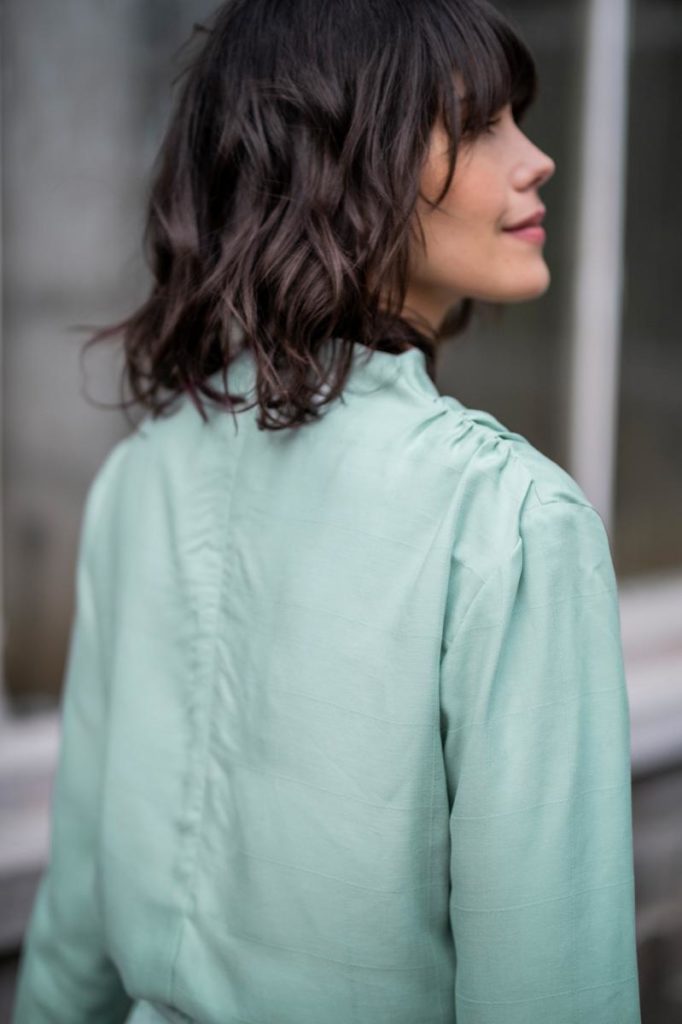 Sky est magnifique dans sa simplicité. Elle le doit en premier lieu à l’encolure relevée drapée avec un effet cascade. Détail élégant numéro deux : la fente à l’extrémité des longues manches droites avec les épaules légèrement froncées. La fermeture éclair est cachée dans le milieu du dos. On vous a bien dit que c’est un projet minimal avec un effet Waouh maximal ?